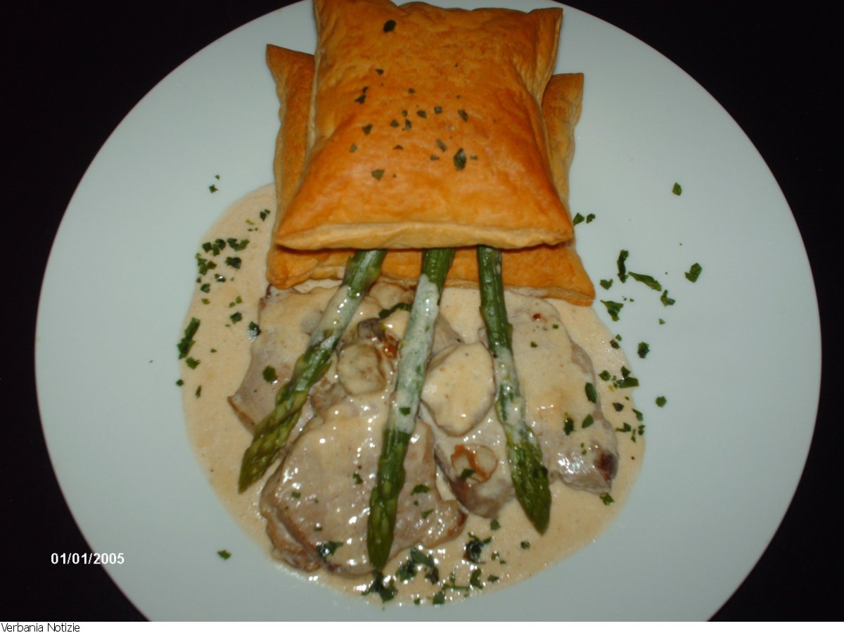 Prendete della pasta sfoglia , la tagliate a quadretti e la fate gonfiare in forno a 200° per circa 20 minuti , nel frattempo fate bollire gli asparagi in abbondante acqua salata . Preparate una crema utilizzando funghi porcini freschi e poca crema di latte . tagliate a fette di circa un centimetro un filetto di maiale , lo passate velocemente in padella con un filo d'olio . Preparate una torretta a due guanciali di sfoglia con gli asparagi , disponete il filetto sotto le punte di asparago e guarnite con la crema di funghi. Spolverate il tutto con pepe e prezzemolo a piacere. Avrete così I GUANCIALI DI SFOGLIA ALLE PUNTE DI ASPARAGO VERDE CON FILETTO IN CREMA DI FUNGHI. Assaggiare per credere![]()