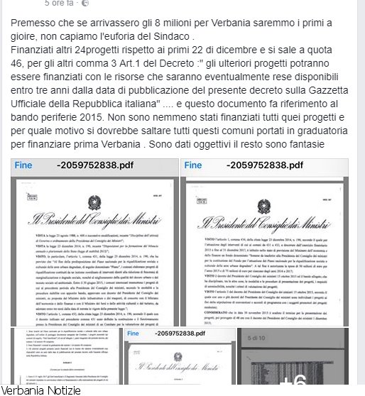 Tanta retorica per l'ennesima "vittoria di Pirro". Ma davvero il PD e Marchionini lavorano così bene? per il momento so che "Verbania Protagonista" non permette al sottoscritto di commentare la loro propaganda a sostegno del Sindaco e il PD si vanta per l'ennesima ripresa di un cantiere... ma poi leggo che i soldi mica sono stati stanziati, riporto nell'immagine quì sotto il post della Consigliera Minore (così qualche genio della politica che inopportunamente siede a SX mi darà del "leghista") , in cui dice che i soldi sono lungi dall'arrivare. Allora qual è la verità?![]()