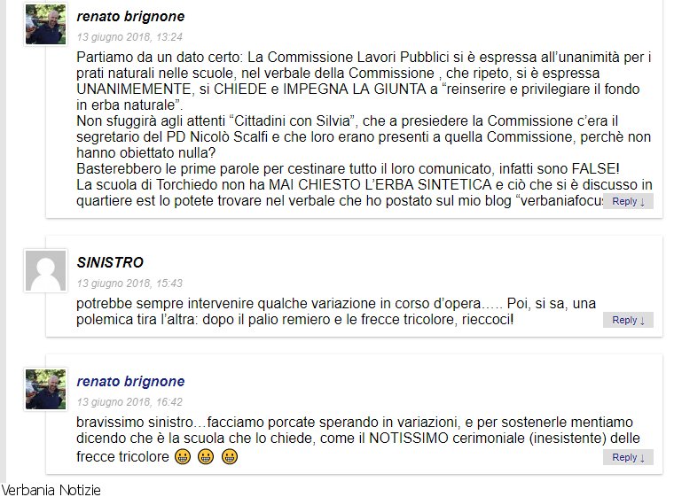 Chiudo qui la questione, che da una valutazione politica fatta dalla nostra lista civica sull'opportunità o meno di posizionare erba sintetica nelle scuole verbanesi e bassamente scaduta su questioni personali. Come volevasi dimostrare.