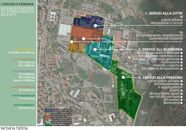 Il lotto 1A, occhio e croce grande come l'attuale Esselunga, prla di completamento insediamenti commerciali esistenti,. Mentre il lotto 2 parla di 2SERVIZI ALL'ECONOMIA", che comprendono "Servizi a persone e imprese", "Innovzione", "commercio" e "funzioni di interesse generale". (veder immagine allegata o scaricate il documento dal sito del comune, a questolink http://www.comune.verbania.it/content/download/52615/510287/file/Masterplan%20progetto%20riqualificazione%20ex%20stabilimento%20Acetati.pdf)
