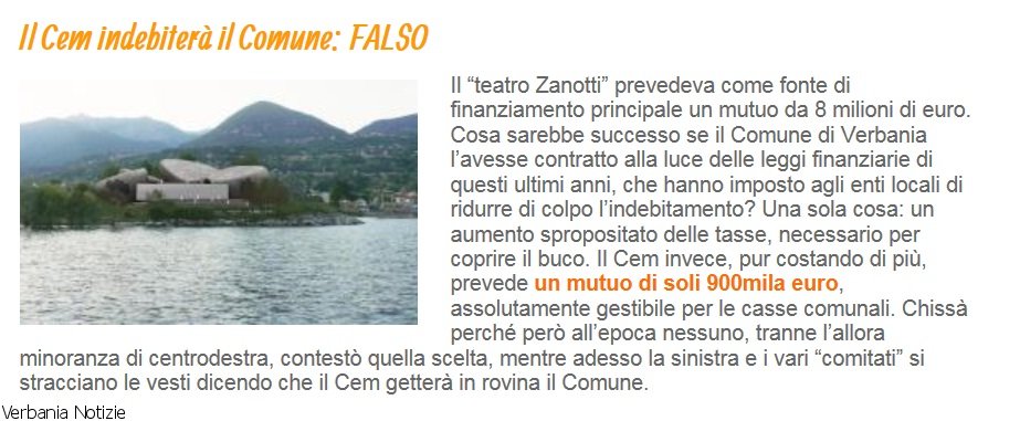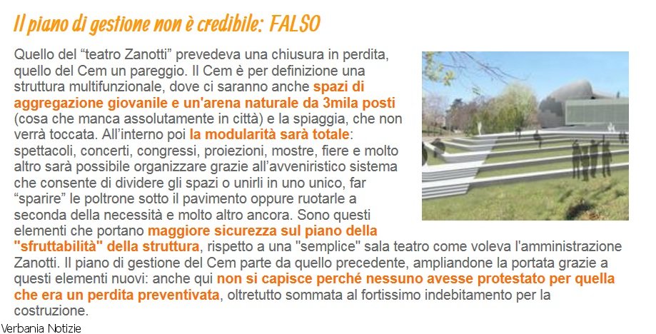 Sul piano di gestione basta dire una cosa: la Fabbrica di Villadossola è una sala teatro e basta, esattamente come lo sarebbe stato quello che si voleva costruire in piazza Fratelli Bandiera. Ecco perchè è in perdita. Da www.cemverbania.it:![]()