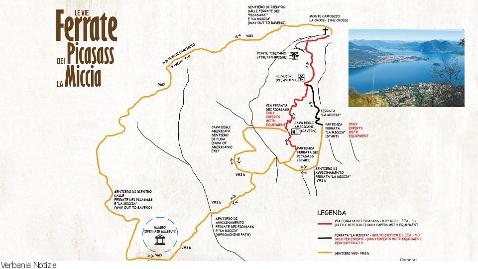 La via ferrata è, per caratteristiche intrinseche, idonea alla fruizione da parte di utenti esperti di alpinismo (livello di difficoltà EEA-MD). Entrambe le vie ferrate si ricongiungono all’uscita con il sentiero VM3 variante, che permette con breve tragitto di collegarsi al percorso principale e rientrare sull’abitato di Baveno, chiudendo così l’anello sportivo. Questi interventi aumentano da un lato gli standard di sicurezza, grazie alla via di fuga, e dall’altro la proposta escursionistica e sportiva con un tratto più atletico e complesso. Ricordiamo che per la salita è sempre obbligatorio l’utilizzo del proprio kit da ferrata».