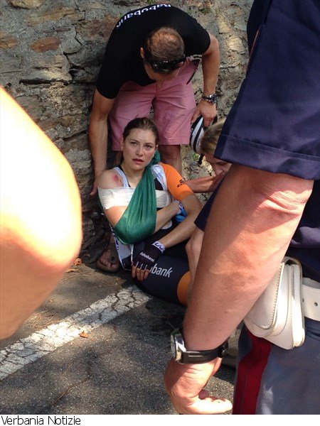 Subito dopo la partenza, ha Ghiffa nel primo strappo di giornata, una brutta caduta ha posto fine alla gara della concorrente con il dorsale numero 5, della squadra Rabobank.