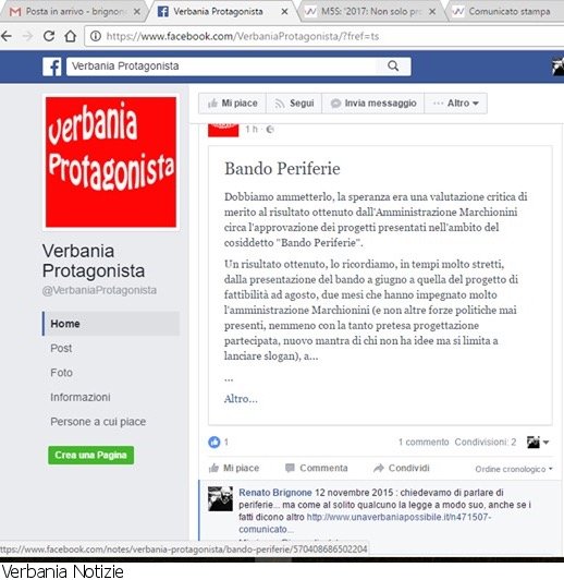 Per quanto riguarda invece l'incontro che il vostro gruppo ha avuto con l'amministrazione le comunico che siamo ben informati, in quanto sia Sindaco Marchionini che l'Assessore Sau fanno parte della Lista Civica ed hanno avuto modo di parlarci del vostro confronto. Avete chiesto un appuntamento per presentare un progetto sulle periferie, vi siete presentati in Comune ed avete esaminato (anche con dei dipendenti comunali) il bando da voi trovato. L'esito dell'incontro è stato che, dopo l'analisi dei criteri per la richiesta di finanziamento, il Comune di Verbania non aveva nemmeno la possibilità di presentare un qualsiasi progetto, in quanto le aree urbane degradate della nostra Città non erano candidabili. Diciamo che in conclusione è stata una perdita di tempo, da parte dell'amministrazione però c'è stato quantomeno l'ascolto, peccato che dall'altra parte non si aveva letto accuratamente il bando (forse non lo si era capito fino in fondo, non tutti sono dei tecnici ci mancherebbe).