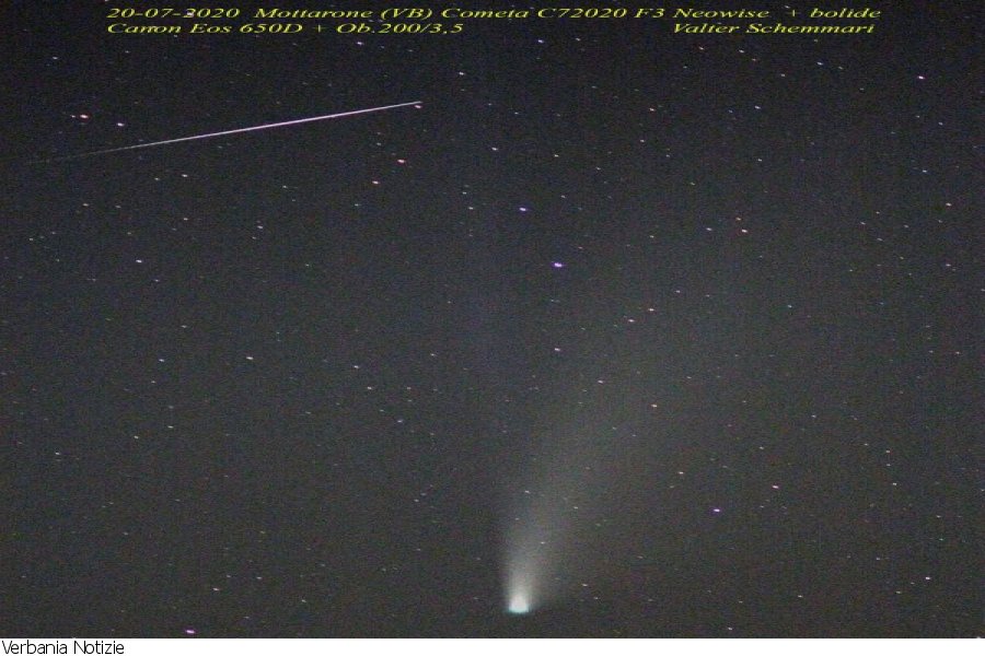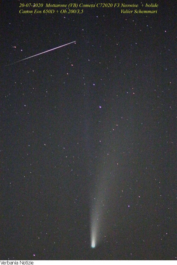 Le sere del 11-12 luglio tentai invano un avvistamento dalle alture sopra Verbania, e riprovai la sera del 17 dalla cima del Mottarone, ma appena vi giunsi, si era tutto coperto di nuvole e nebbia fitta, seguite poi da temporale e pioggia. Dopo aver sempre rinunciato alla ricerca della cometa, la sera del 20 luglio tornai sul Mottarone e, nonostante la presenza di nubi, attesi il buio e finalmente vidi la cometa ad occhio nudo, scattando diverse fotografie con obbiettivi da 29-50-135 e 200mm di lunghezza focale, a fianco di astrofili e di un giovane pubblico che chiedeva la cortesia di vedere la cometa al mio binocolo e nelle mie foto appena scattate con la fedele reflex. Come potete vedere, in una di queste ero riuscito fortunosamente a registrare anche la traccia di un meteorite, che definirei bolide per la sua luminosità e dimensione.