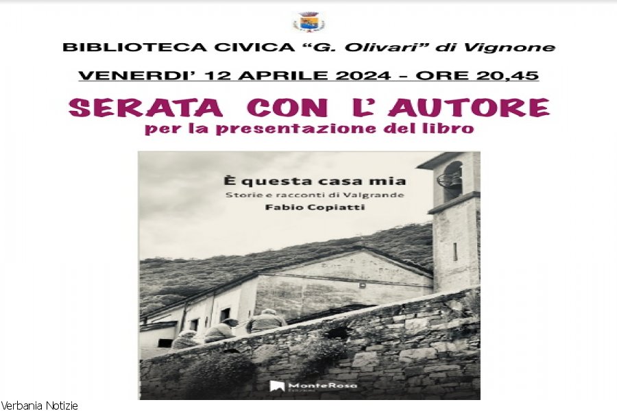 Venerdì 12 aprile 2024, alle ore 20.45, presso la biblioteca di Vignone, si terrà la presentazione del libro di Fabio Copiatti "E' questa casa mia"
