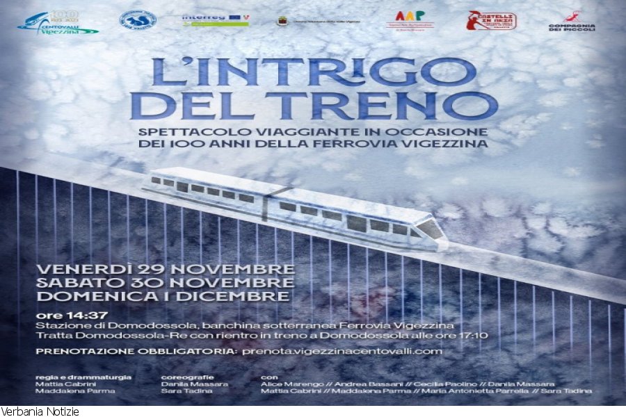 Alle ore 14.37 di venerdì 29 e sabato 30 novembre e di domenica 1 dicembre, sulla banchina sotterranea della Ferrovia Vigezzina Centovalli a Domodossola (ingresso da Piazza Matteotti o direttamente dall'imbocco del tunnel, presso il posteggio di via Piave) originali capotreni, facchini e viaggiatori d’antan accoglieranno ed accompagneranno il pubblico a bordo del trenino protagonista della corsa speciale nonché dello spettacolo viaggiante, che unisce teatro, danza, canto e musica dal vivo. L’intrigo del treno, divertente e misteriosa rappresentazione creata appositamente per i festeggiamenti della linea ferroviaria che unisce Italia e Svizzera, andrà in scena nel tratto italiano, da Domodossola a Re, con rientro nel capoluogo ossolano previsto per le ore 17.10.